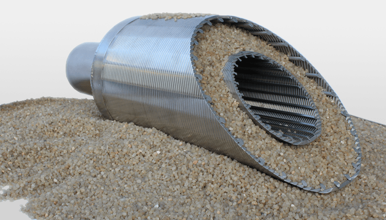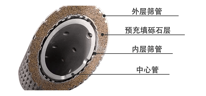 雙層預(yù)充填篩管主要是由外層篩管、內(nèi)層篩管、預(yù)填充礫石層和中心管組成。將直徑不同的單層繞絲篩管組焊在一起,在雙層篩管所形成的環(huán)型空間內(nèi)預(yù)先緊密填充石英砂后夯實封閉,形成多層擋砂屏障,防止地層砂進入生產(chǎn)井筒,起到以砂防砂的作用。 礫石充填及高溫膠結(jié)在地面完成,施工方便,可減少施工作業(yè)時間,后處理容易,見效快效果明顯。此外,雙層預(yù)充填篩管抗壓強度高,滲透率高,過流面積大,適用于普通直井和斜井。
